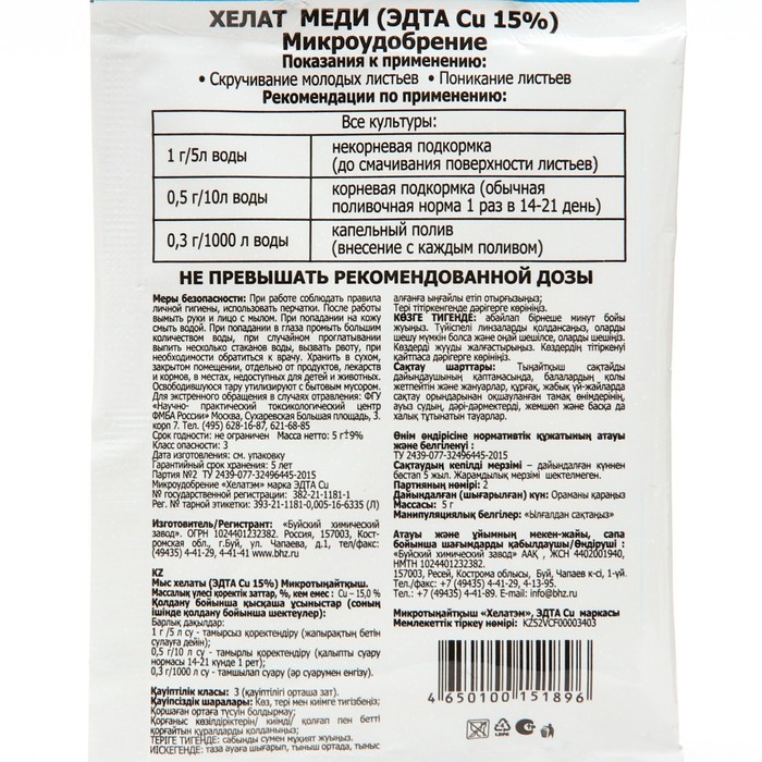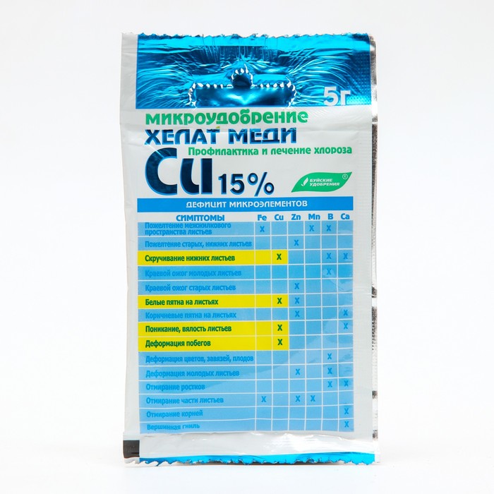 Хелат меди - высокоэффективное экологически чистое водорастворимое микроудобрение в биологически активной форме, применяется для профилактики и лечения болезней и хлороза вызванного дефицитом меди. Медь важна для фотосинтеза, метаболизма белков и углеводов. Под ее влиянием активируются ферменты, предотвращающие разрушение клеток растений. Медь повышает устойчивость растений к грибковым и бактериальным заболеваниям. Способствует устранению отрицательных факторов, вызываемых ее недостатком, лучшему развитию растений, увеличению урожайности и значительному повышению качества продукции.