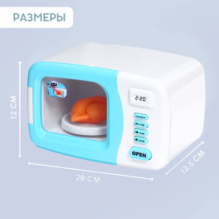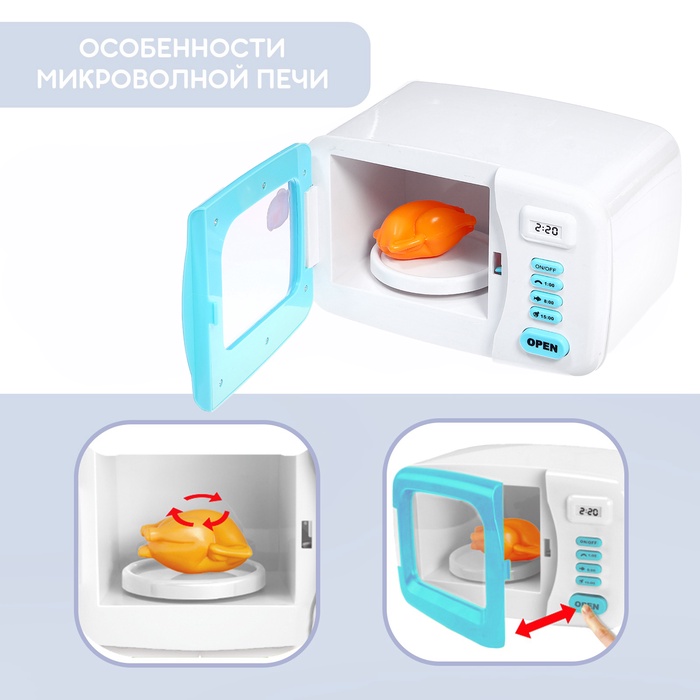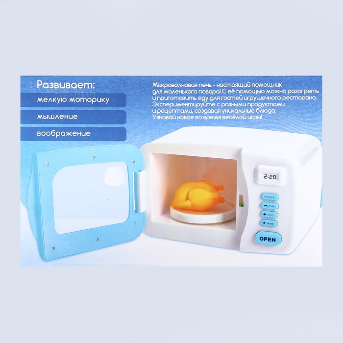 Устройство выглядит как настоящее: чтобы открыть дверцу, достаточно нажать на кнопку, а когда она закроется, тарелка внутри начнёт вращаться. Клавиши светятся и информируют о нескольких режимах приготовления. Девочка выберет способ и включит прибор. Как только блюдо будет готово, раздастся характерный звук — можно накрывать на стол.
