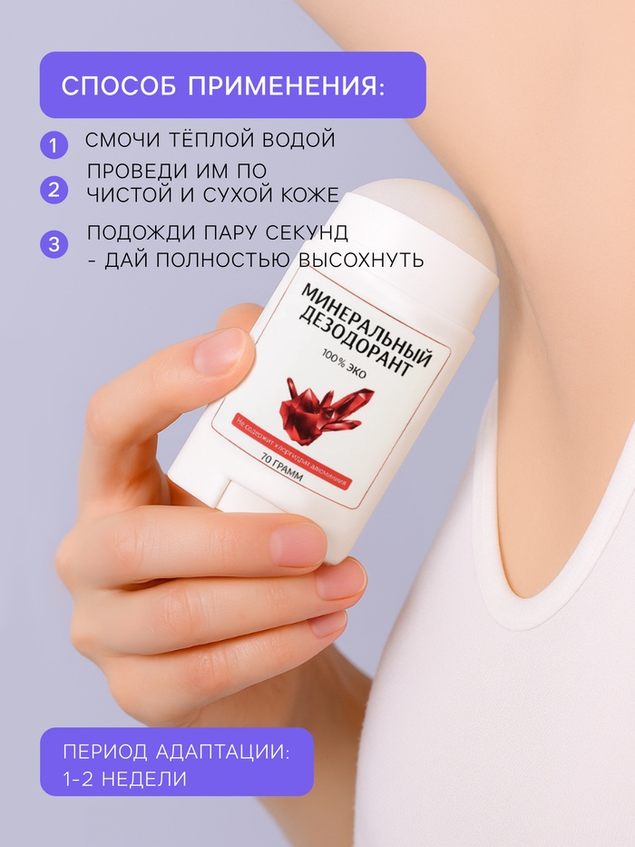Минеральный дезодорант в стике. Представляет собой натуральный кристалл алунит, обладающий высокой антибактериальной активностью. Предотвращает появление пота и неприятного запаха в течение всего дня. Заживляет ранки и увлажняет. Форма стика приятна именно тем, что можно использовать именно столько поверхности кристала, сколько нужно. Стик имеет механизм поднятия и опуска кристалла.