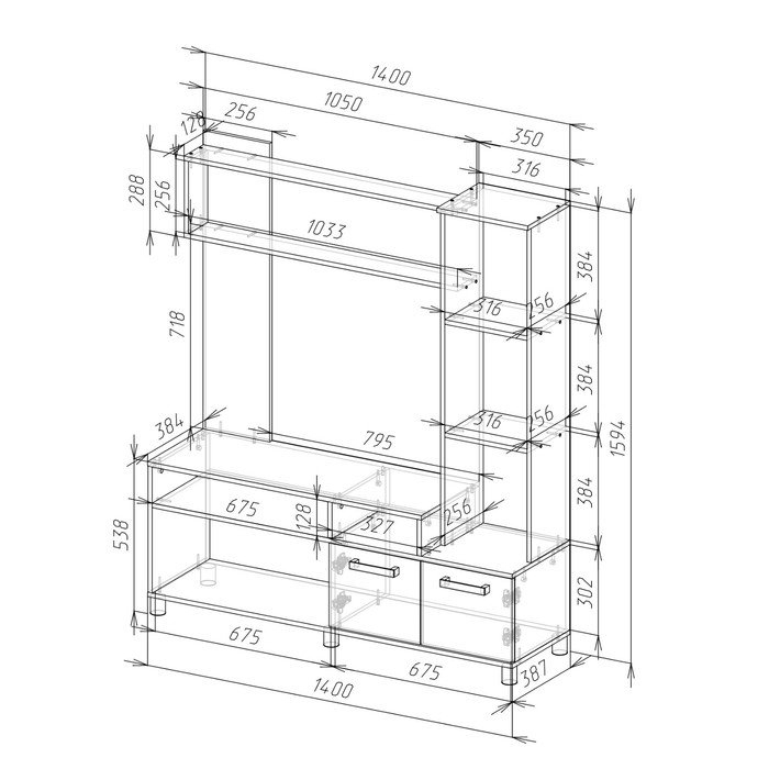 - Ниша под телевизор: мини-стенка оборудована удобной нишей размером 384x1051 мм, подходящей для большинства современных телевизоров.