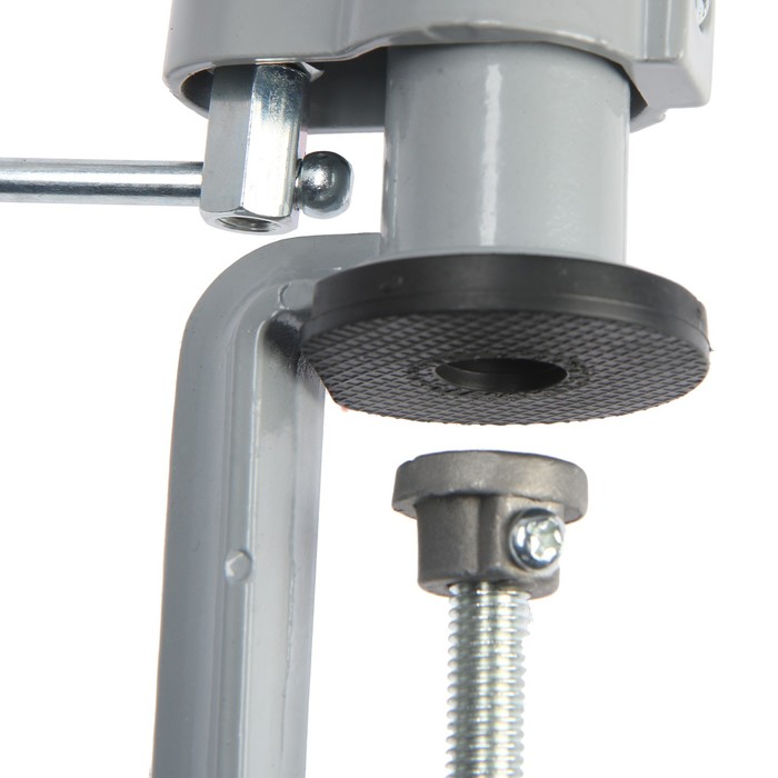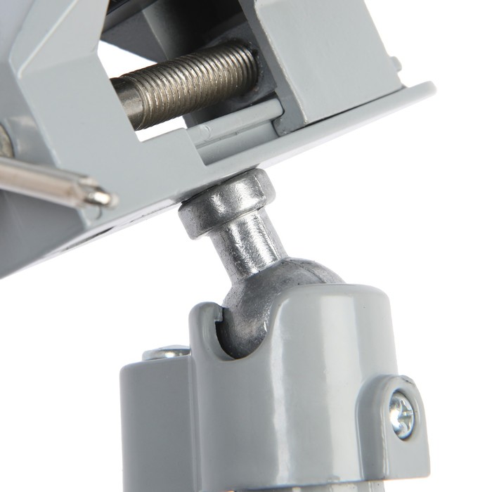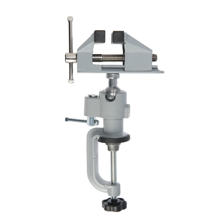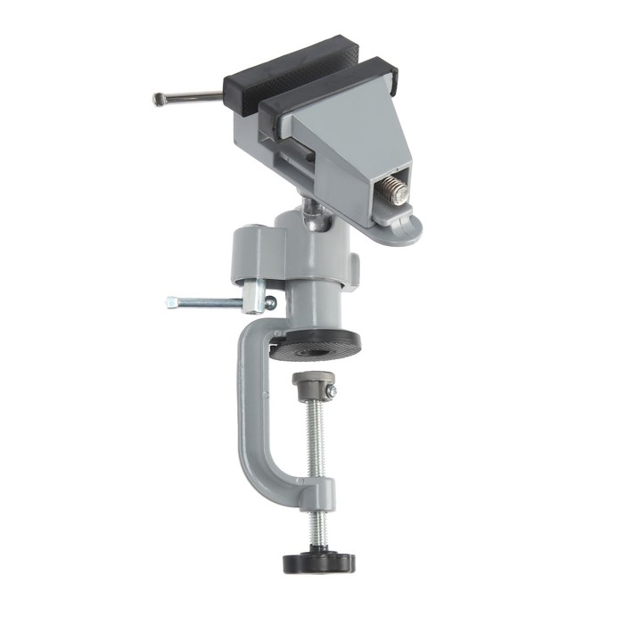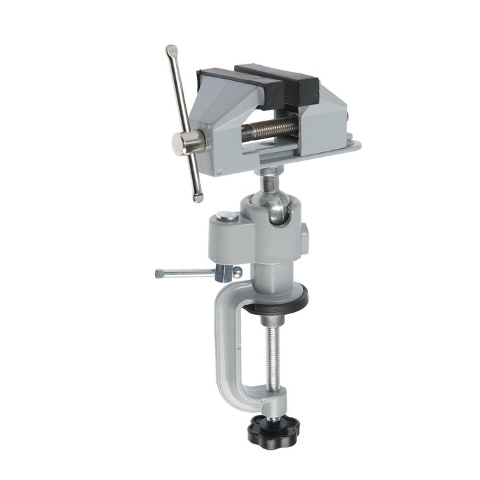 Модель изготовлена из алюминиевого сплава. Фиксация тисков на столе происходит при помощи винтового зажима, который обеспечивает быстрое крепление. Изделие свободно вращается, благодаря поворотному шарниру, что позволяет работать под разным углом.
