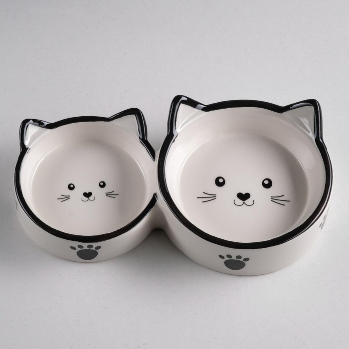 Миска керамическая «Кошачье семейство» двойная 40 и 60 мл - 19×10.5×3.5 см, белая/чёрная