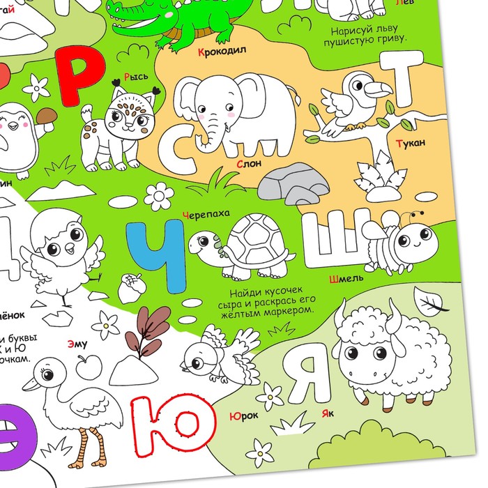 - Двусторонний плакат размером 30 × 42 см с изображениями букв алфавита и милых животных.