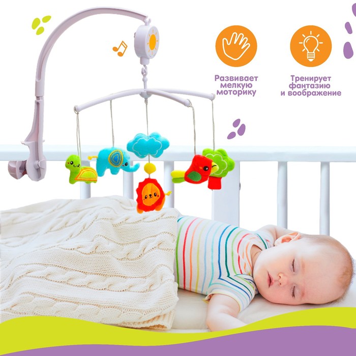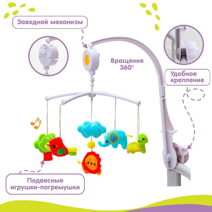 Нежные мелодии для самых маленьких! Музыкальный заводной мобиль «Африка» создаёт уютную атмосферу в детской. Механизм запускает вращение подвесных игрушек и нежные мелодии, помогая малышу расслабиться перед сном.