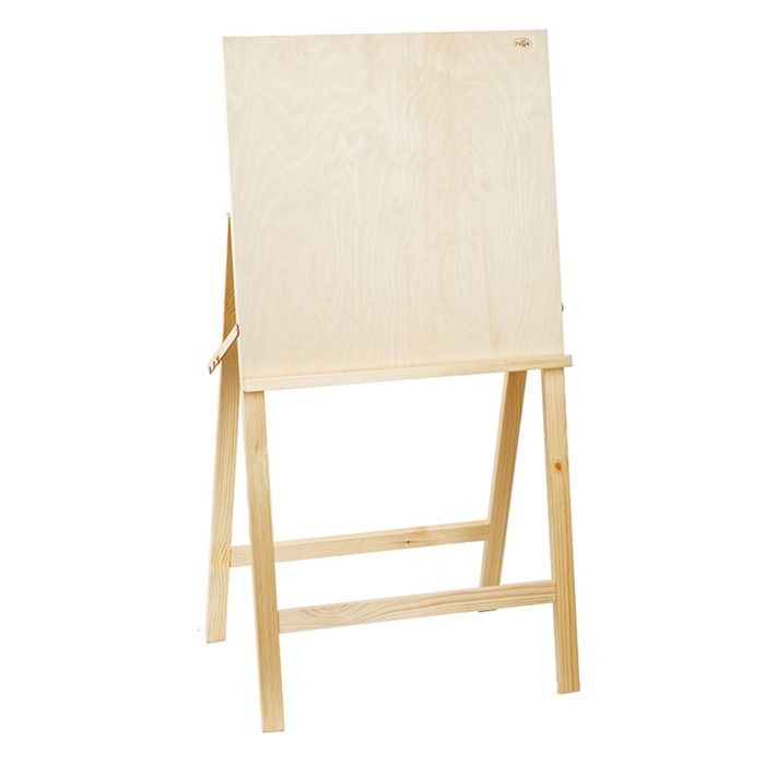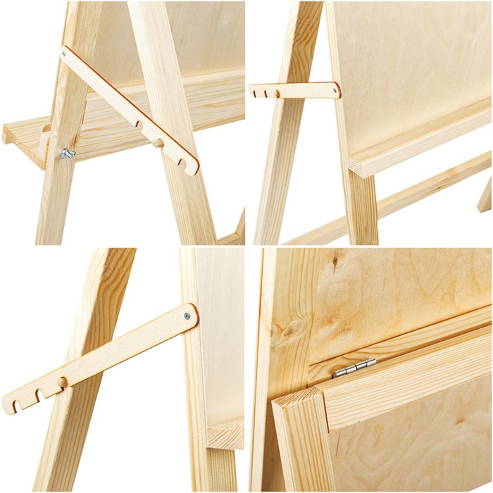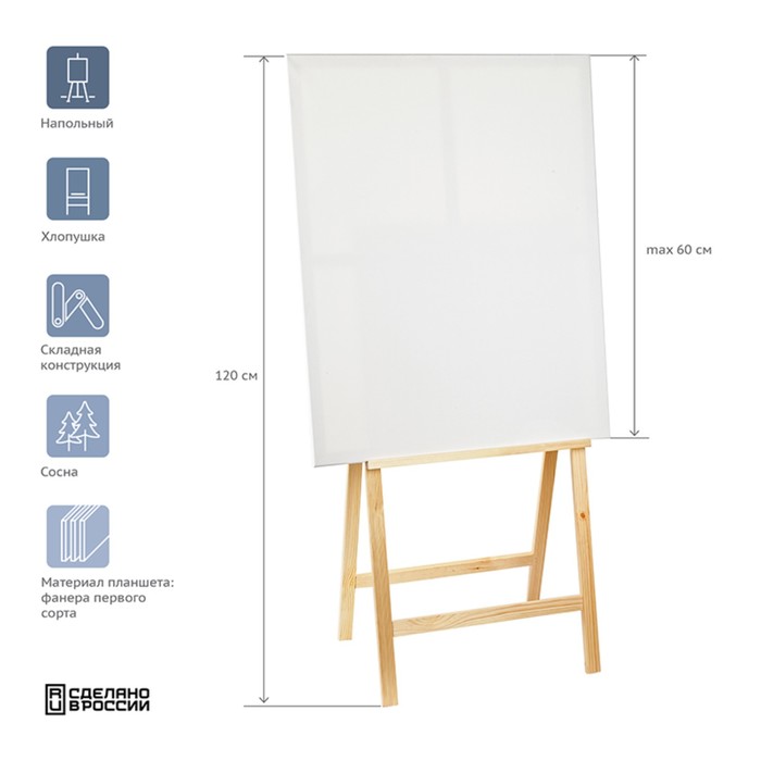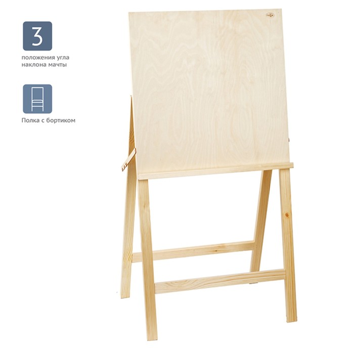 Мольберт имеет простую конструкцию: три положения угла наклона рабочей поверхности, полка с бортиком для художественных материалов. Бумагу на планшете можно закрепить кнопками или малярным скотчем. Мольберт производится в России из сосны и фанеры первого сорта. Все поверхности зашлифованы для безопасности и комфорта работы художника. Мольберт подходит для занятий в студии и дома, он складывается и не занимает много места при хранении.