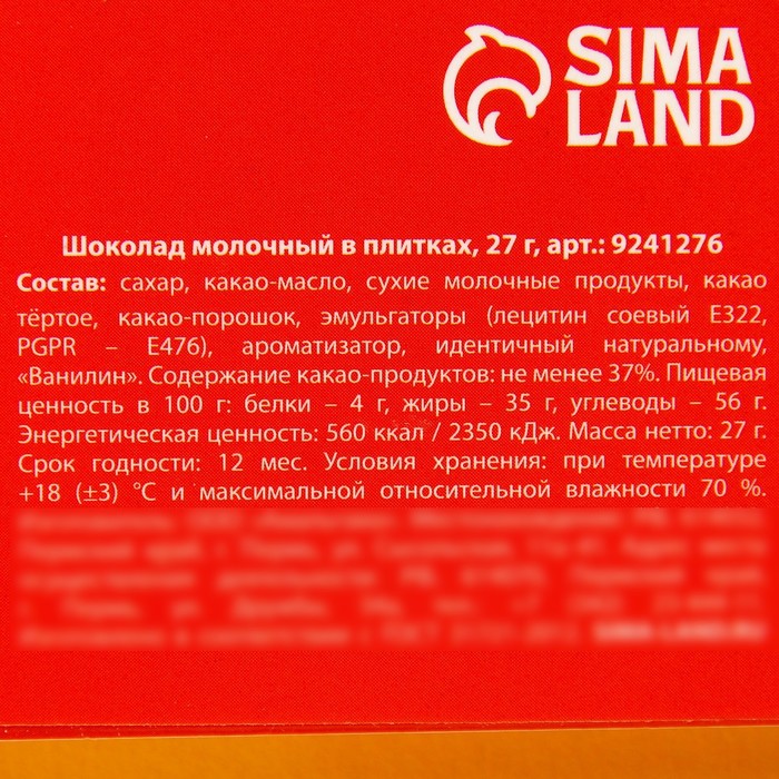 Состав: сахар, какао-масло, сухие молочные продукты, какао тёртое, какао-порошок, эмульгаторы (лецитин соевый Е322, PGPR – E476), ароматизатор, идентичный натуральному, «Ванилин».