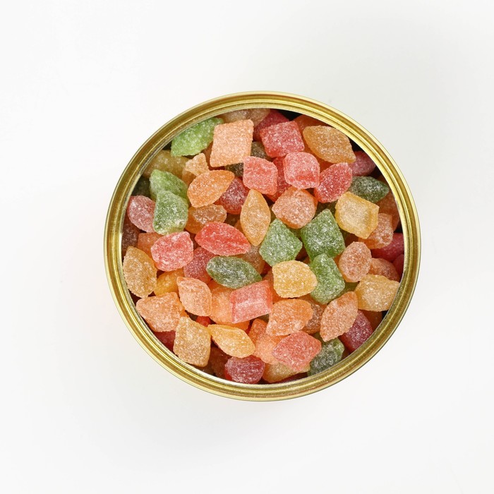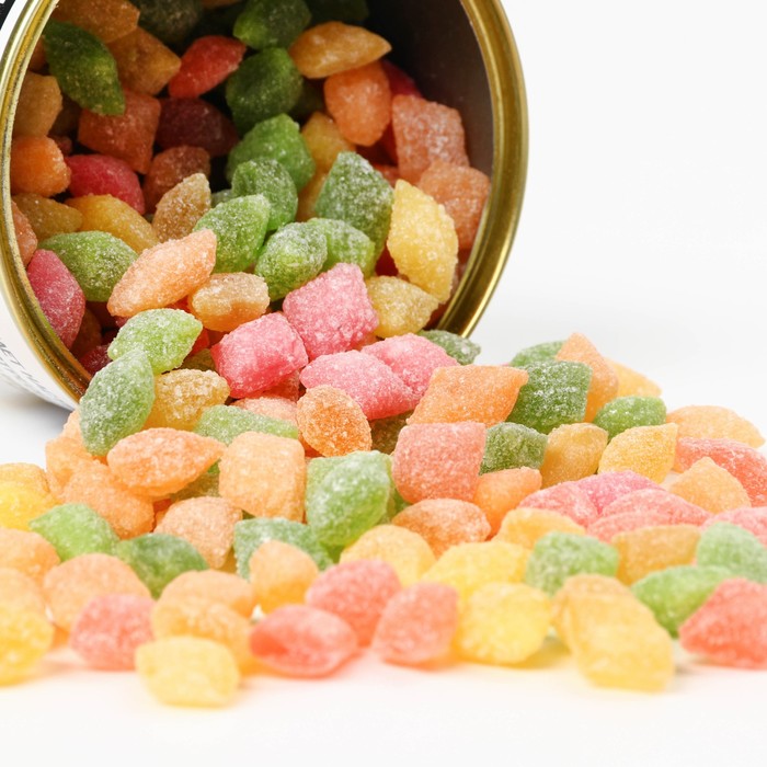 Состав: сахар белый кристаллический, патока крахмальная, регулятор кислотности - лимонная кислота (Е330), ароматизаторы: "Смородина", "Малина", "Абрикос", "Лимон", "Яблоко", красители (Е102, Е110, Е129).