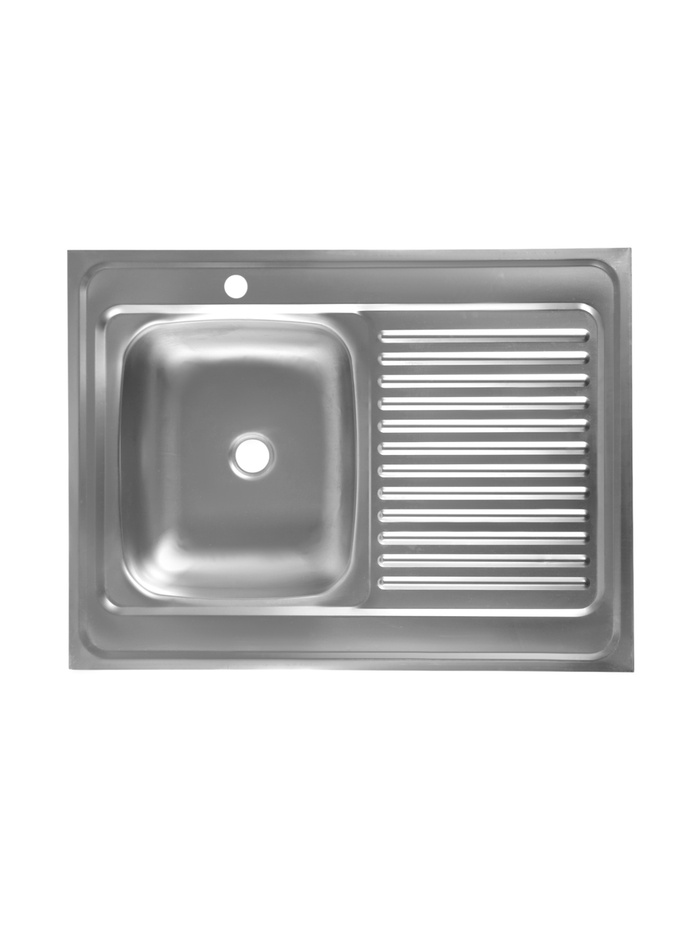 Накладная кухонная мойка с левой чашей и правым крылом, размер 80×60 см, глубина 16 см, из нержавеющей стали — модель для установки на тумбу. Мойка имеет одну чашу, расположенную слева, и правое крыло для сушки посуды или размещения принадлежностей. Изготовлена из нержавеющей стали толщиной 0.4 мм с матовой поверхностью. Сифон приобретается отдельно.