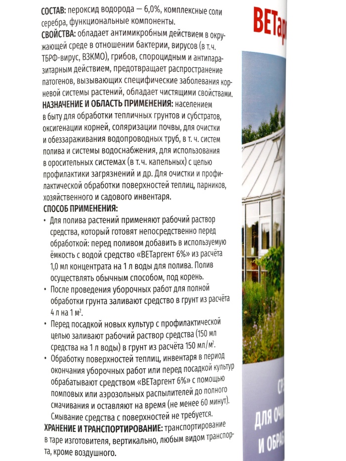 ВЕТаргент 6% отличается выраженным очищающим действием и помогает поддерживать гигиеническую чистоту всех элементов теплицы — от стеклянных и поликарбонатных панелей до металлических и пластиковых конструкций. Регулярное применение способствует созданию более благоприятного микроклимата для растений, что особенно важно в условиях интенсивного выращивания.