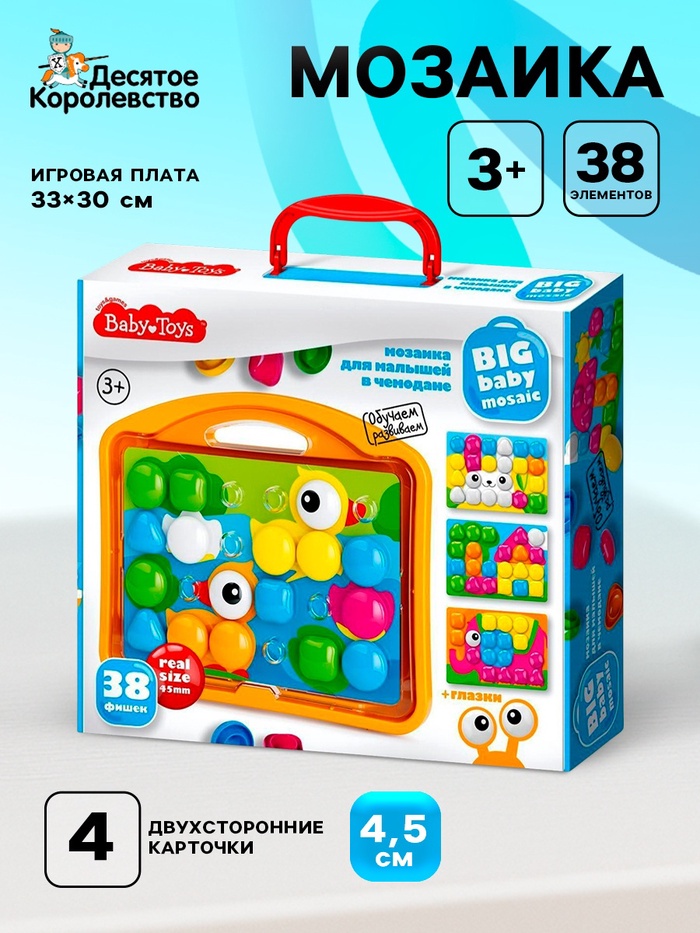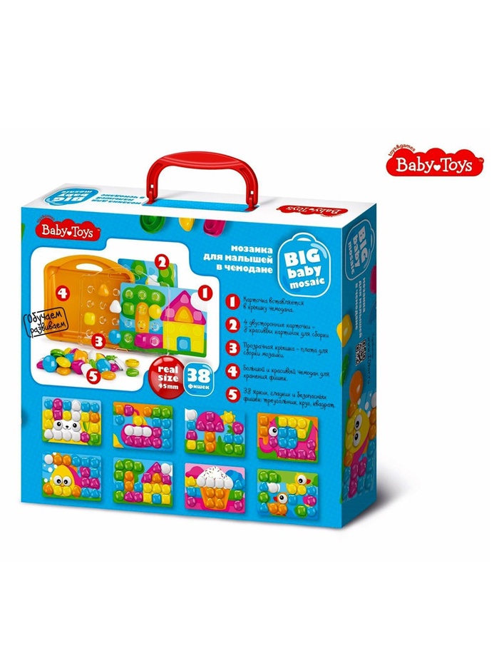 Мозаика «Утята» в чемодане с крупными фишками отлично подойдёт для малышей от 3 лет. Благодаря форме и размеру деталей она абсолютно безопасна. Набор способствуют формированию правильного захвата предметов, а также поможет изучить цвета и понятие длины.