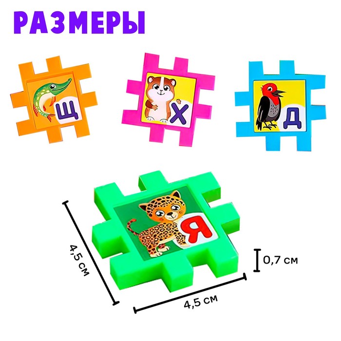 - 36 волшебных кусочков: соединяй буквы — и вот уже улыбается медвежонок, машет хвостом тигр или прыгает зайка! Можно собирать, разбирать и придумывать свои весёлые комбинации.