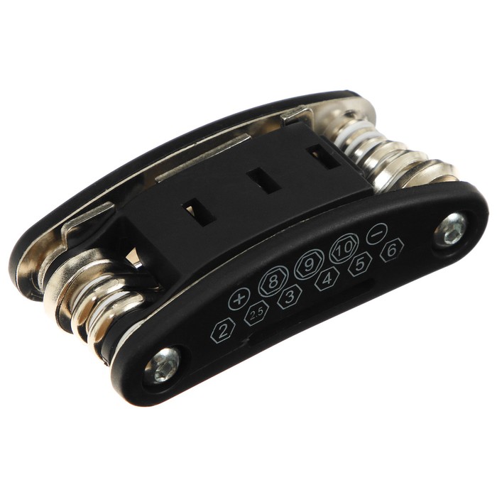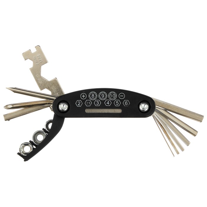 Многофункциональный набор содержит в себе сразу несколько инструментов для ремонта велосипеда. Благодаря компактному размеру, мультитул легко брать с собой на случай необходимости ремонта. Особенно необходим в поездках на длинные дистанции.