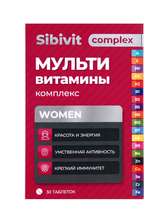 Мультивитаминный комплекс Sibivit для женщин, 30 таблеток по 1,3 г — это сбалансированная формула витаминов и минералов, разработанная с учётом физиологических особенностей и ежедневных потребностей женского организма. Комплекс помогает поддерживать здоровье, красоту и энергию, способствует укреплению иммунитета, нормализует обмен веществ и улучшает общее самочувствие. Активные компоненты направлены на поддержание кожи, волос и ногтей, а также на стабилизацию эмоционального фона и защиту организма от последствий стресса и высоких нагрузок.