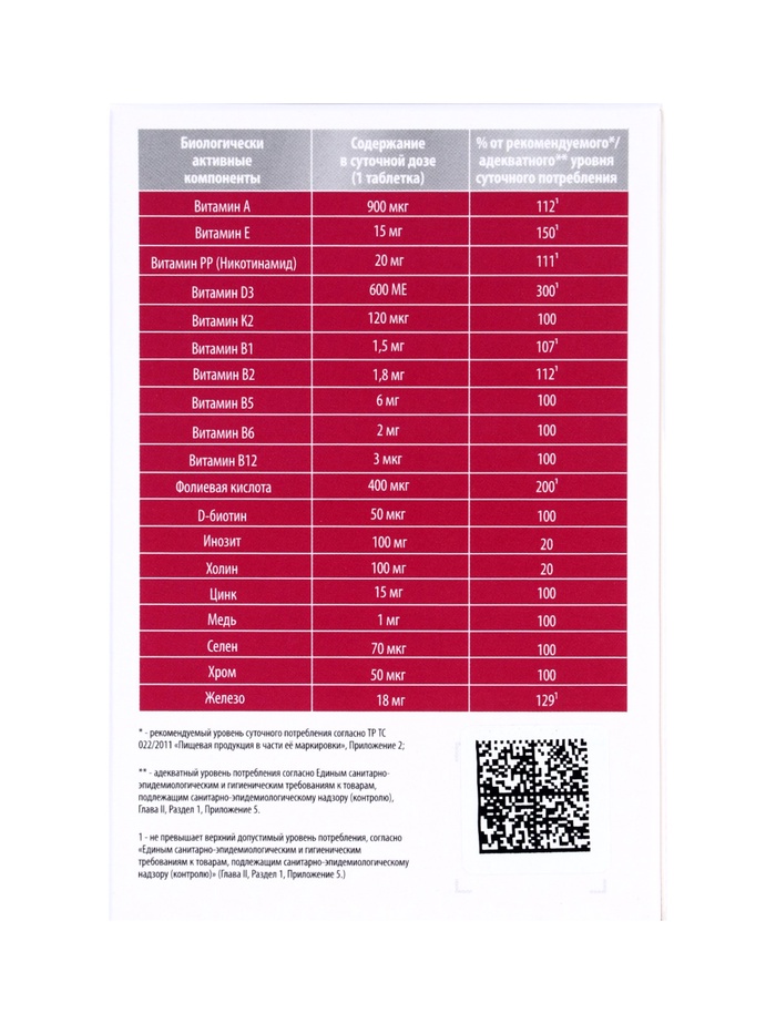 - Удобная форма — всего одна таблетка в день покрывает большую часть ежедневных потребностей.