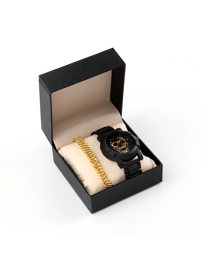 Мужской подарочный набор «Череп» 2 в 1: наручные часы, браслет, золотистый