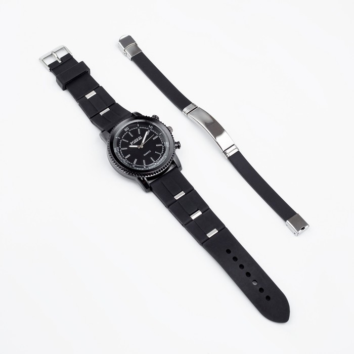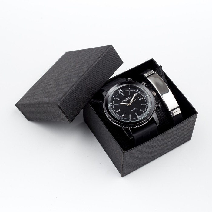 Набор элегантных аксессуаров для мужчины станет прекрасным долонением к повседневным образам мужского гардероба. Набор включает наручные часы с циферблатом черного цвета и браслет с яркой бляшкой.