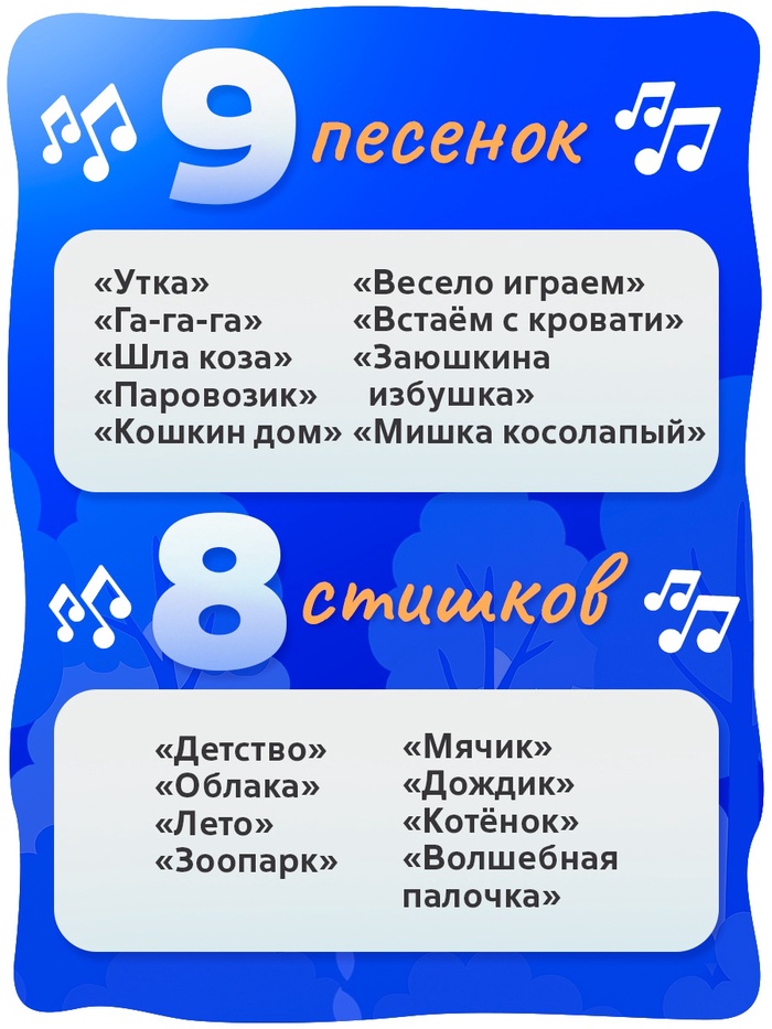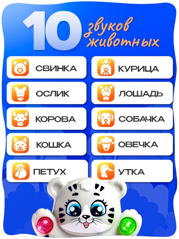 Зверёк воспроизводит весёлые фразы, названия животных и их звуки, песенки, мелодии и забавные стишки.