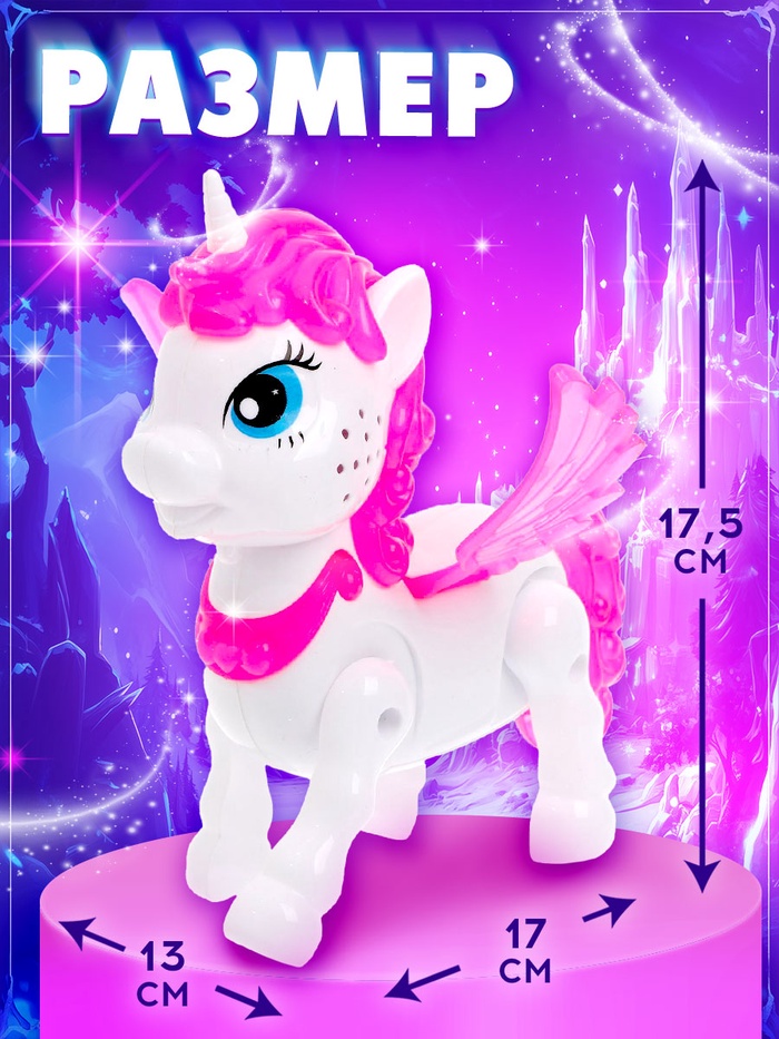 - Малышка сможет наблюдать, как единорог двигается под музыку, а её грива и хвостик мерцают яркими огоньками. Это создаёт волшебную атмосферу, будто пони прилетела из сказочного мира.