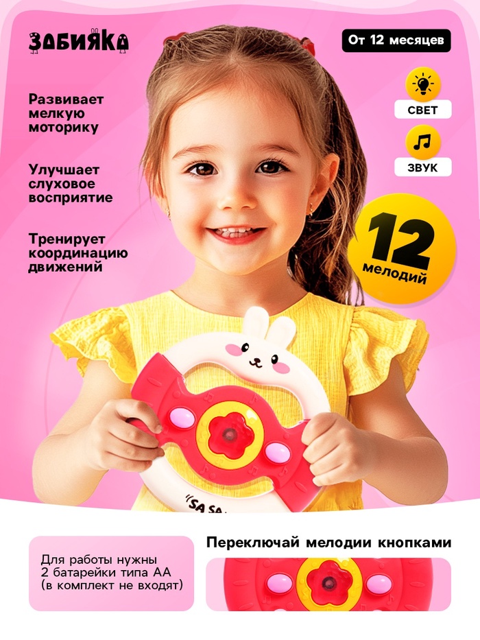 Музыкальный руль «Малыш зайчик» — это яркая и увлекательная игрушка для малышей от 12 месяцев. Она станет отличным спутником в играх и поможет развить координацию, слуховое и зрительное восприятие. Розовый цвет и световые эффекты привлекают внимание, а звуковые функции делают игру ещё интереснее.