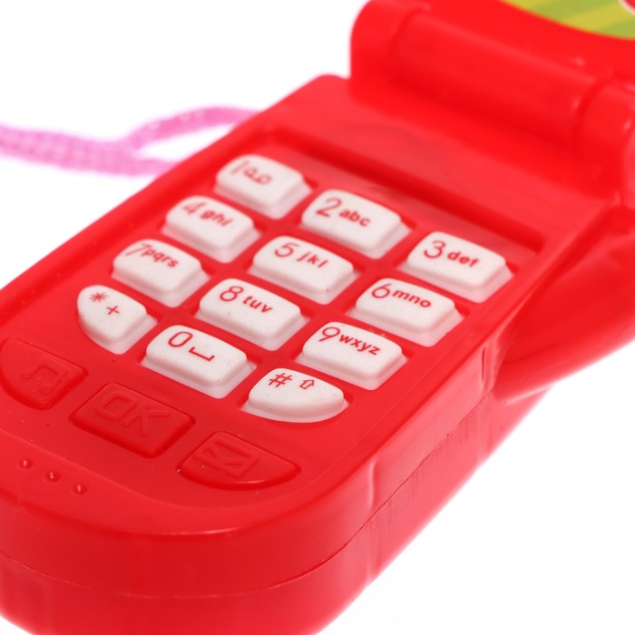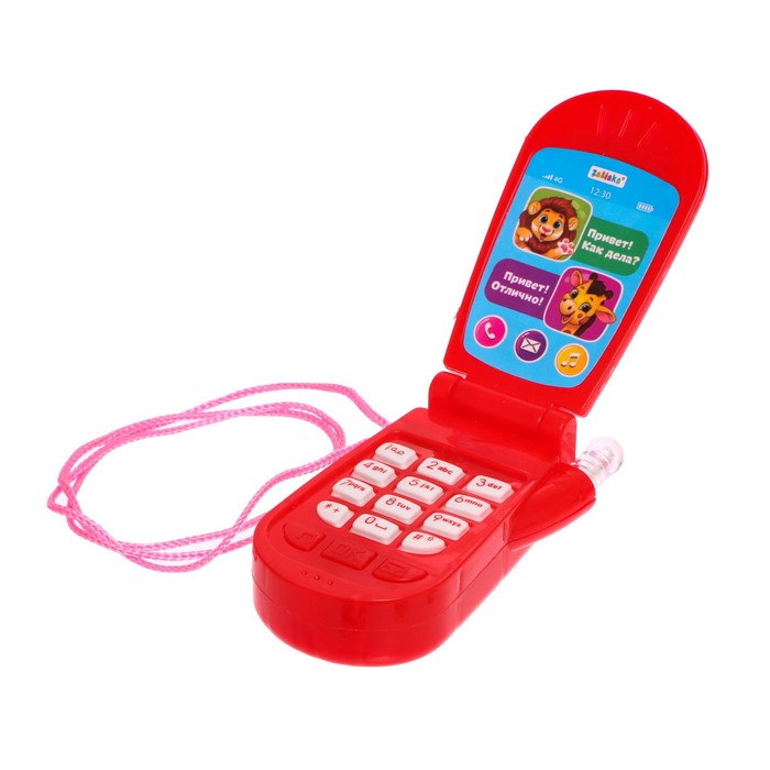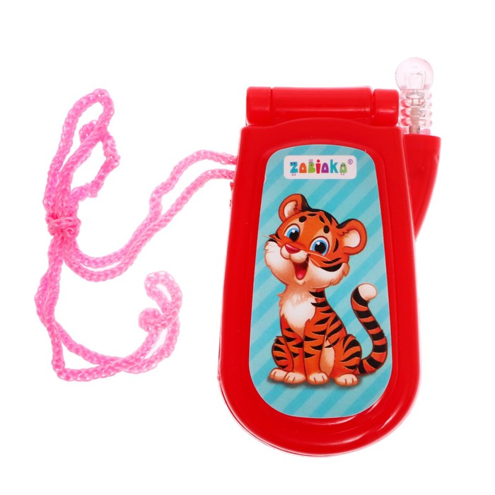 Яркий огонёк и картинки привлекут внимание ребёнка. Телефончик можно носить на шее. Есть верёвочка.