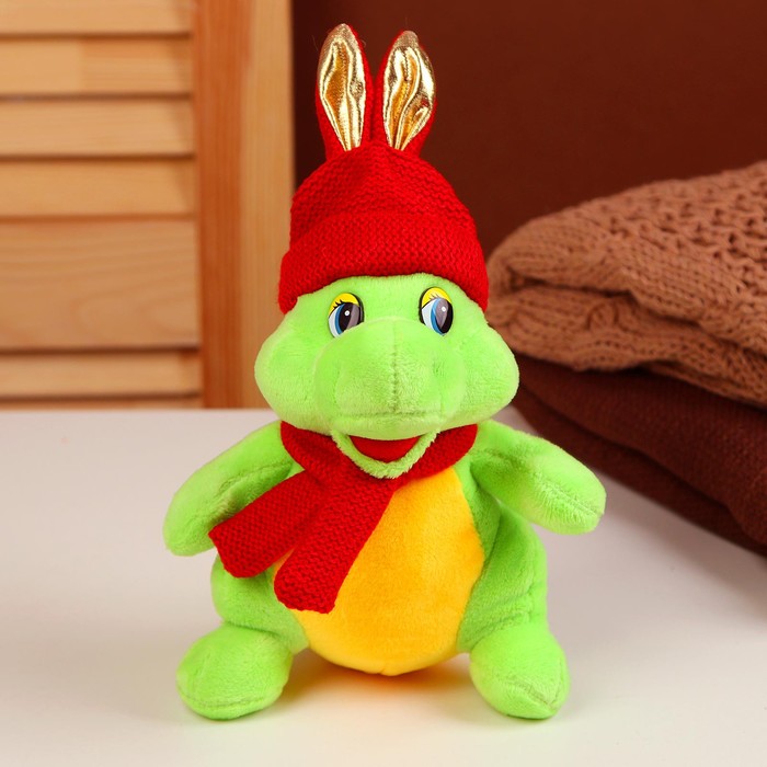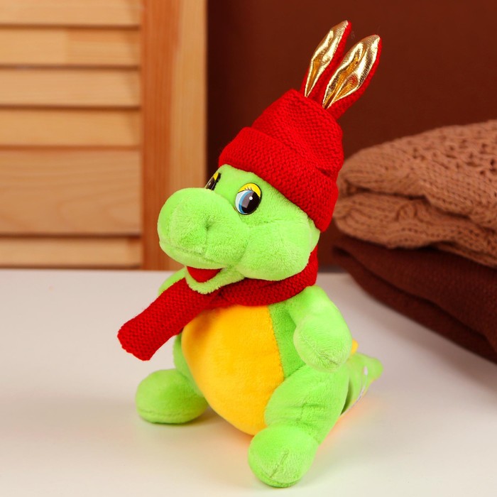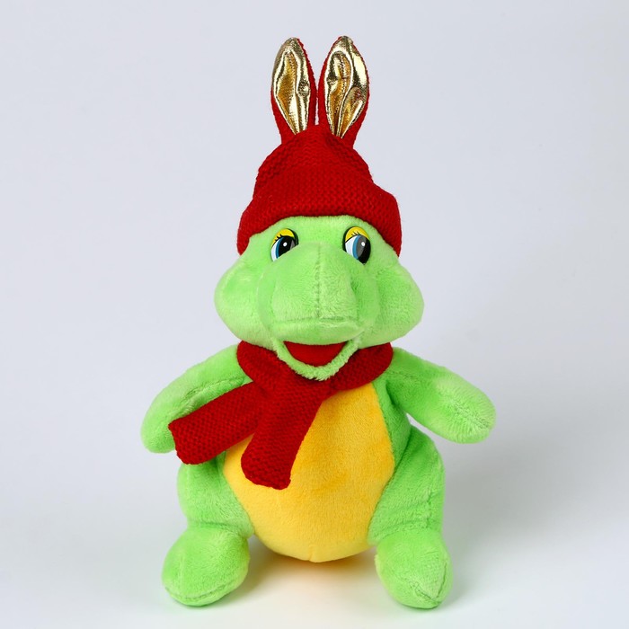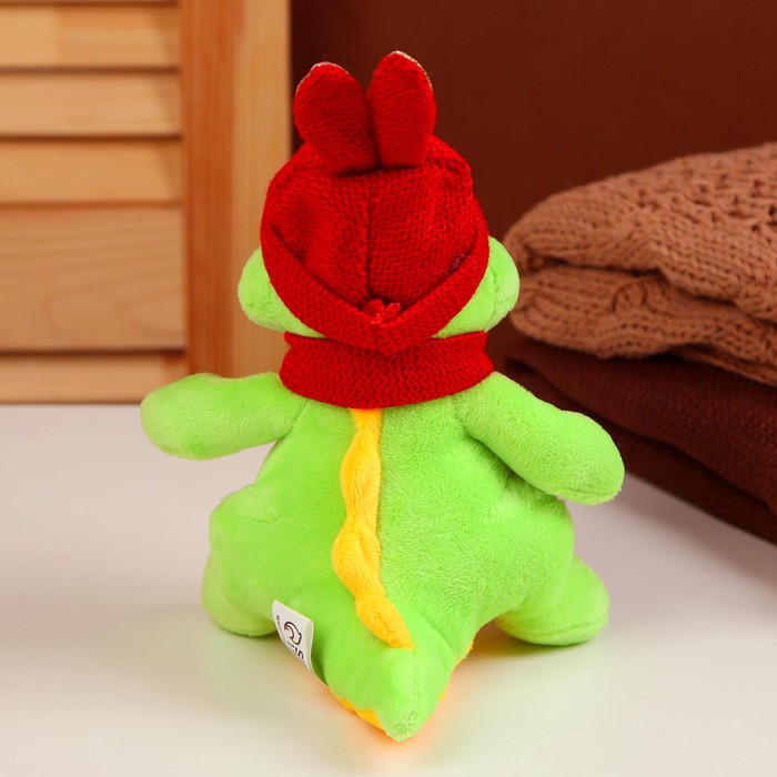 - Игрушка выполнена в виде милого дракона с красочной шапкой, добавляющей игривости.