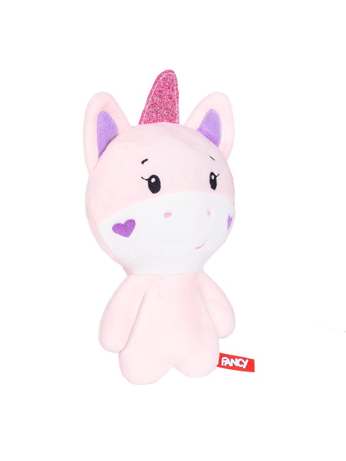 - Игрушка выполнена в виде очаровательного единорога с вышитыми фиолетовыми сердечками на мордочке, что добавляет ей особого очарования.