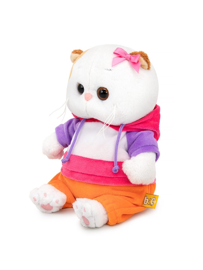 - Игрушка выполнена в виде милой кошечки в стильном костюмчике в стиле спорт-шик — уникальный образ добавляет игривости и индивидуальности.