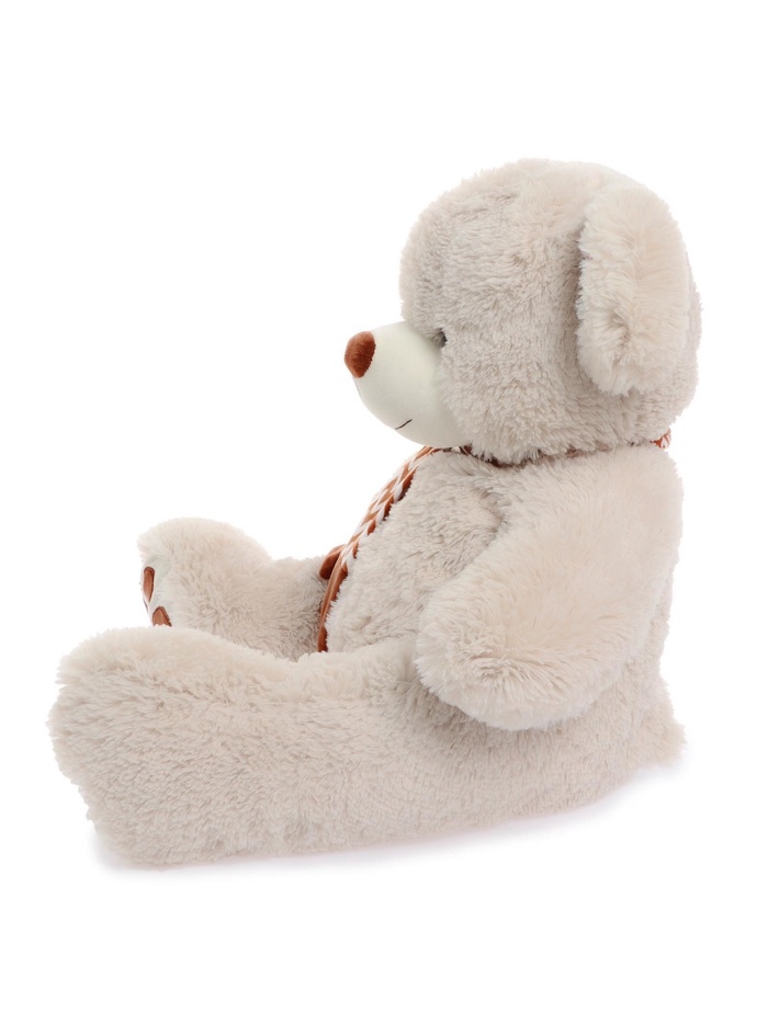 Мягкая игрушка «Медведь Макс» — уютный плюшевый медведь в светлом бежево-молочном оттенке с выразительными коричневыми акцентами. Образ дополняют шарф с геометрическим узором и декоративные вставки на лапках, которые придают игрушке аккуратный и законченный вид.