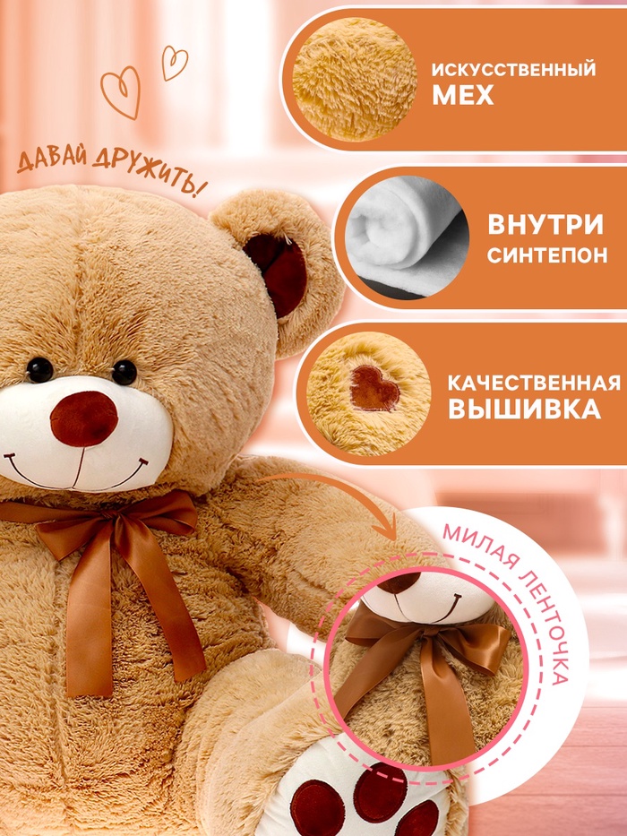 - Игрушка выполнена в виде большого медведя с мягкой и приятной текстурой.