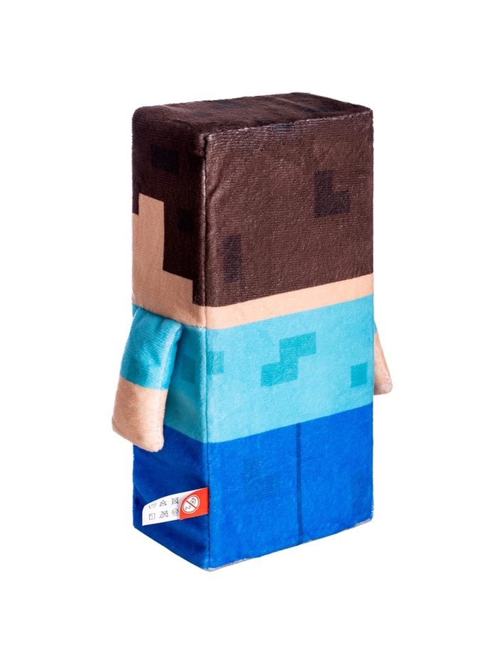 - Игрушка выполнена в виде любимого персонажа компьютерных игр — кубического Стива, который привлекает внимание своим узнаваемым образом и яркими цветами.