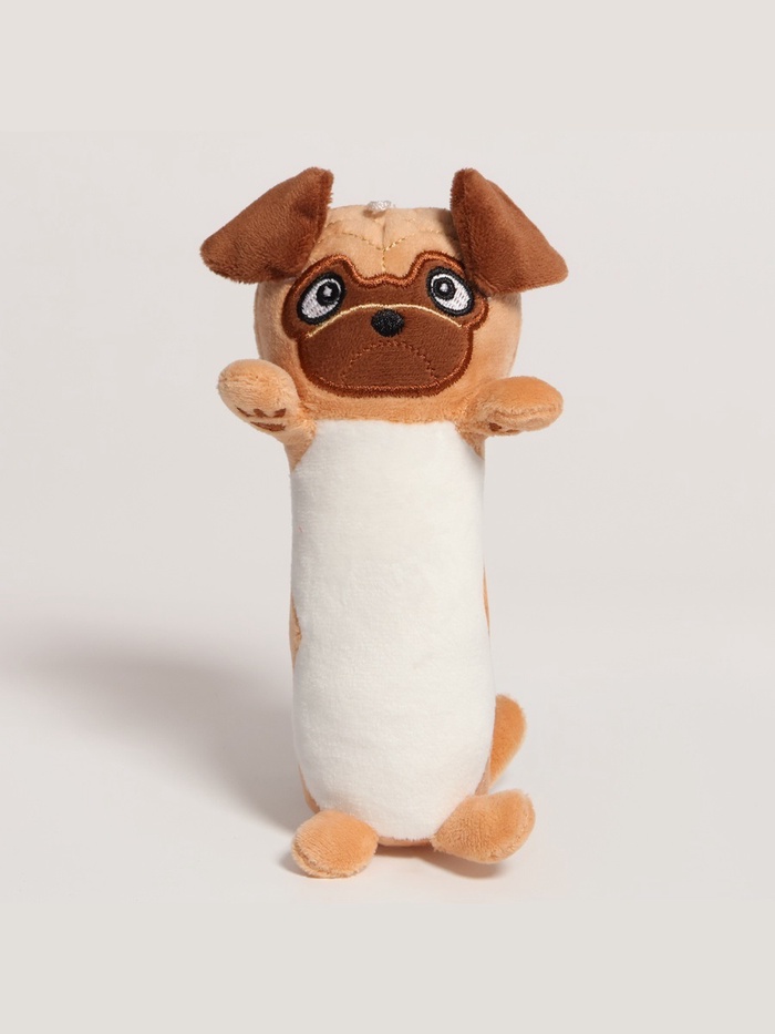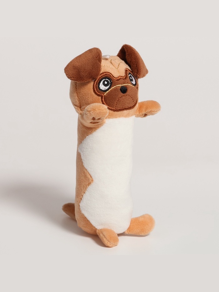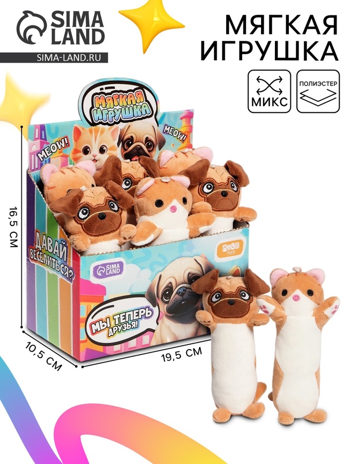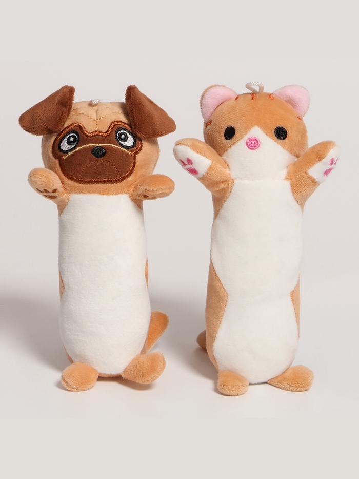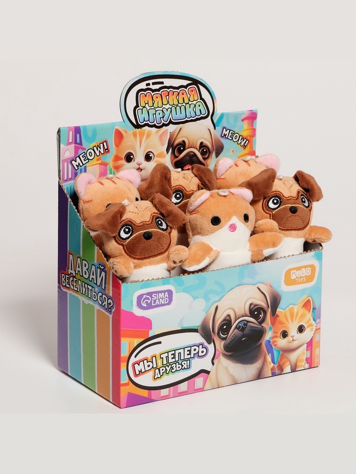- Игрушка выполнена в виде очаровательного котика или пёсика с мягким покрытием.