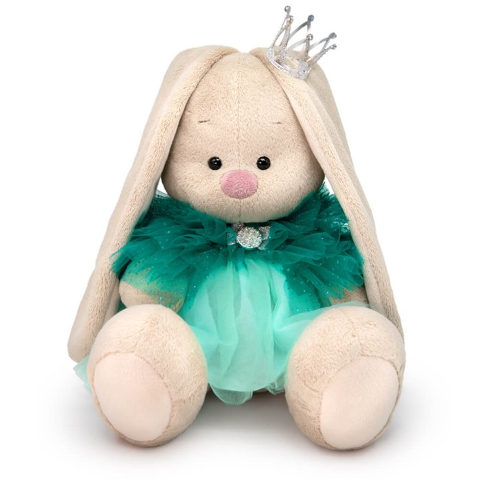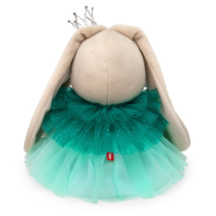- На зайке платье из тонкой ткани с верхним слоем из нежной сеточки цвета бирюзовой воды, украшенное пышным воротником из нефритовой сеточки с блестящими вкраплениями и серебристым бантом с шикарной брошью со стразами. На голове серебряная корона с кристаллами.