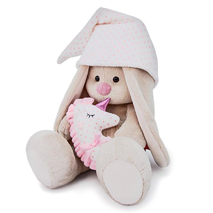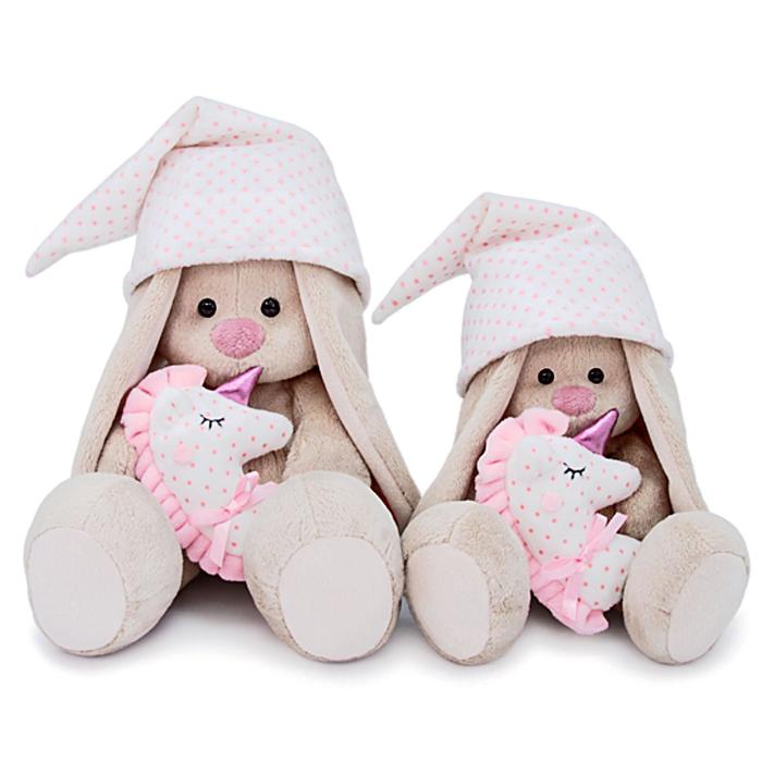 Милая мягкая игрушка «Зайка Ми» — это хороший подарок для ребёнка или кукольного коллекционера. Зайка в комплекте для сна: в лапках игрушки милая подушка в виде спящего единорога, которая сочетается с белым колпаком в розовый горошек. Колпак можно снять.
