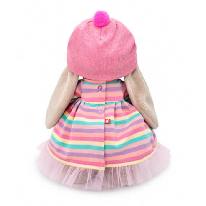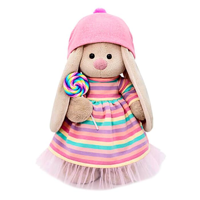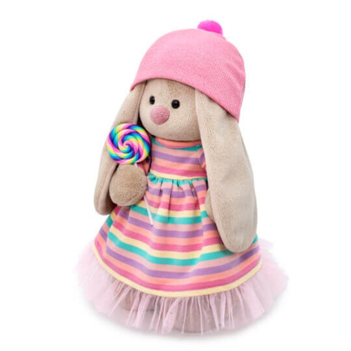 Милая мягкая игрушка «Зайка Ми» — это хороший подарок для ребёнка или кукольного коллекционера. На зайке трикотажное платье в полоску, которое сочетается с разноцветным леденцом, на голове розовая шапочка. Все элементы одежды снимаются.