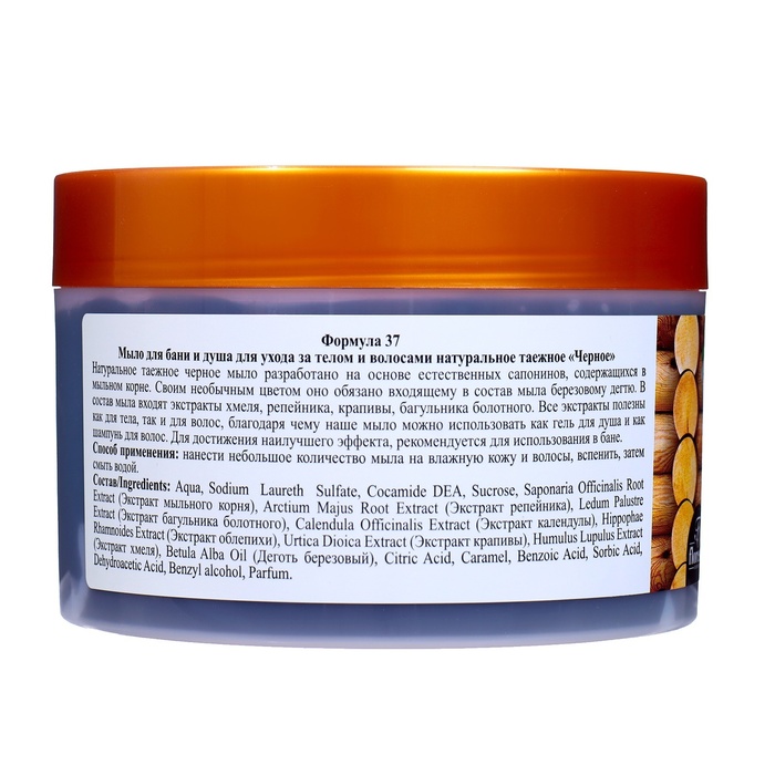 Натуральное таежное черное мыло разработано на основе естественных сапонинов, содержащихся в мыльном корне. Своим необычным цветом оно обязано входящему в состав мыла березовому дегтю. В состав мыла входят экстракты хмеля, чистотела, репейника, крапивы, багульника болотного а также масло эвкалипта. Все экстракты и масла полезны как для тела, так и для волос, благодаря чему наше мыло можно использовать как гель для душа и как шампунь для волос. Для достижения наилучшего эффекта, рекомендуется для использования в бане.