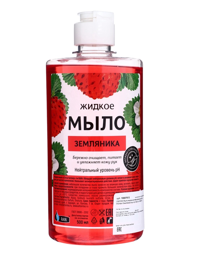 Описание: крем-мыло антибактериальное Rain Standart, антибактериальное, земляника. Жидкое крем-мыло идеально подходит для использования в офисах, отелях, ресторанах и других общественных местах. Средство универсального применения отлично очищает и смягчает кожу, обеспечивает уход и увлажнение, обладает приятным ароматом эфирных масел.