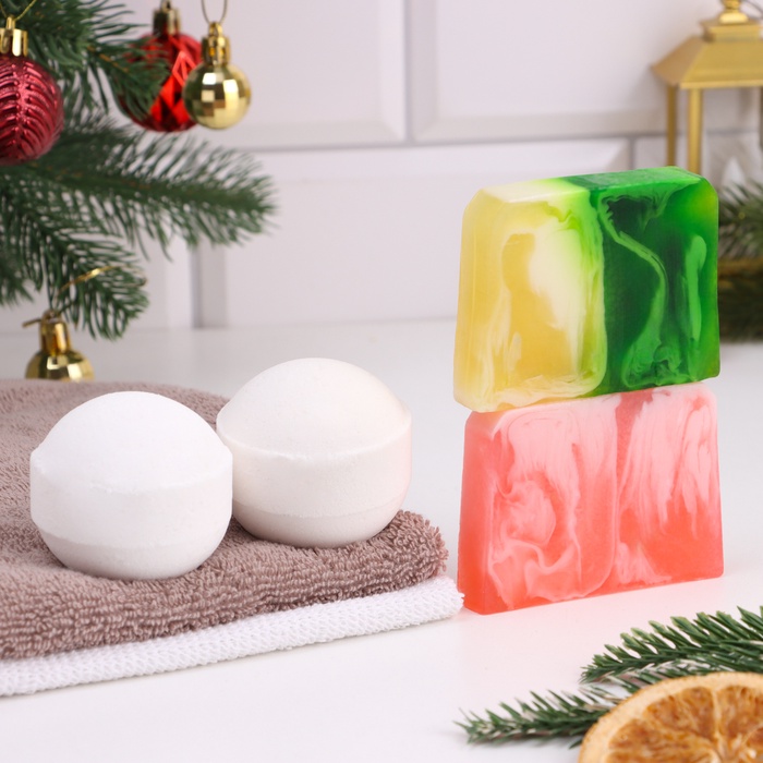 Погрузитесь в мир роскошного ухода с набором для ванны, включающим 2 ароматные бомбочки и 2 мыла.