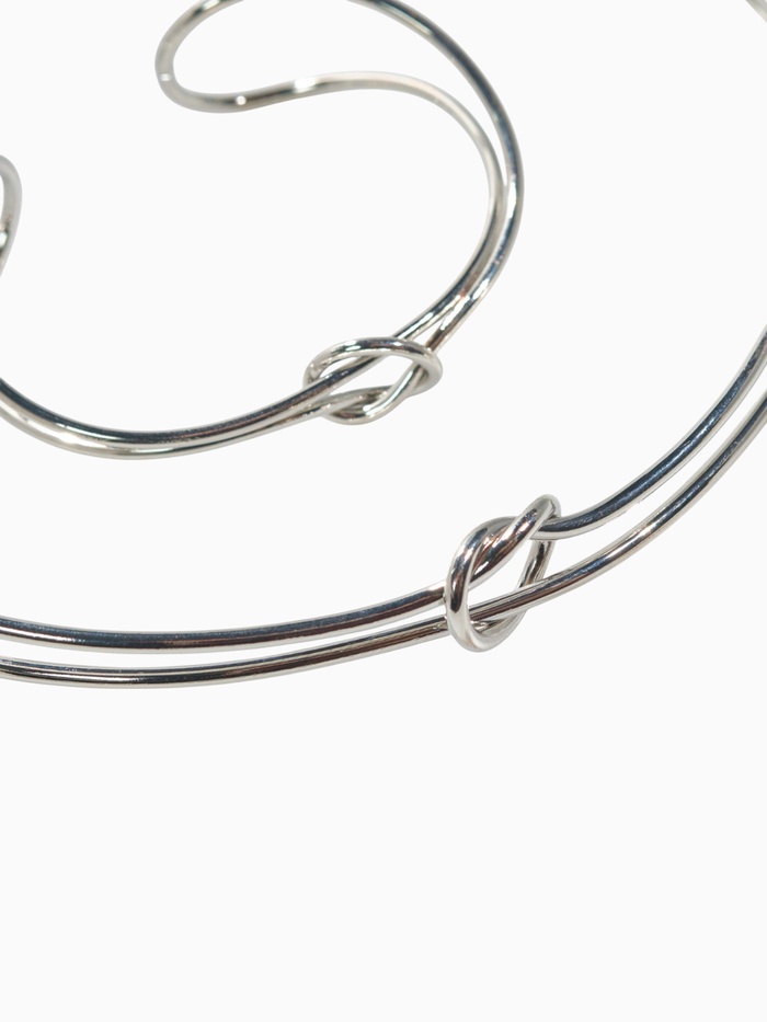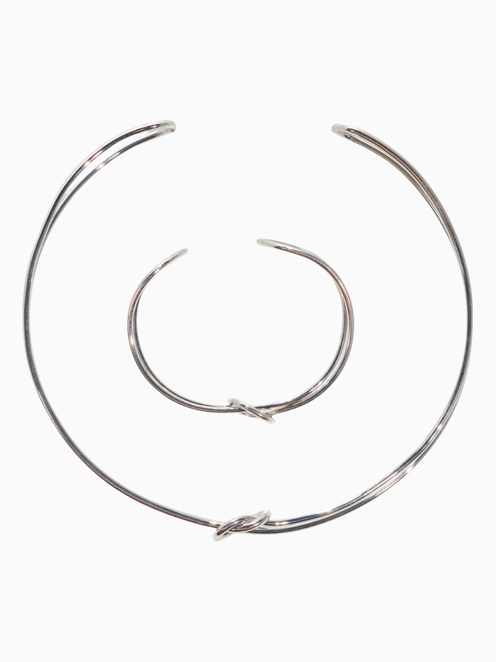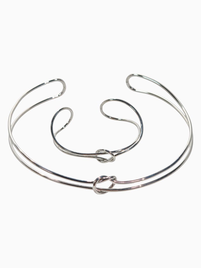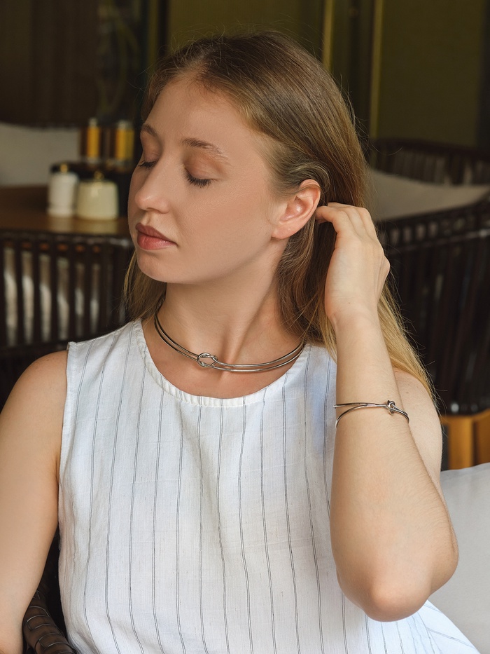 Серебристый комплект из чокера и браслета с изящным узлом «Обруч» — это сочетание современного минимализма и утончённой элегантности, которое легко впишется в любой гардероб. Лаконичный дизайн без вставок подчёркивает чистоту линий и делает аксессуары универсальными для повседневного и вечернего образа.