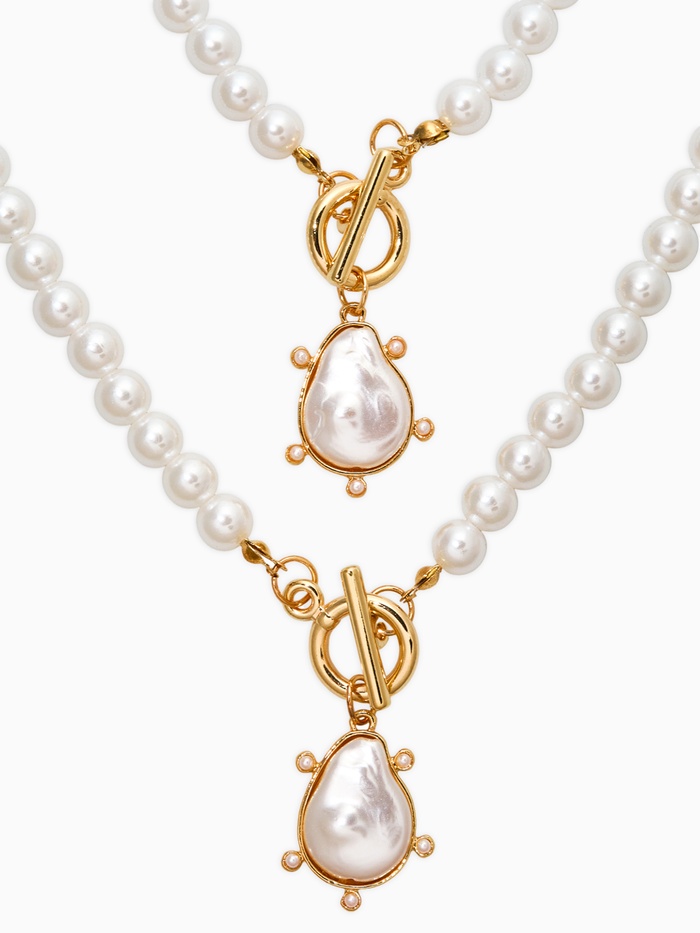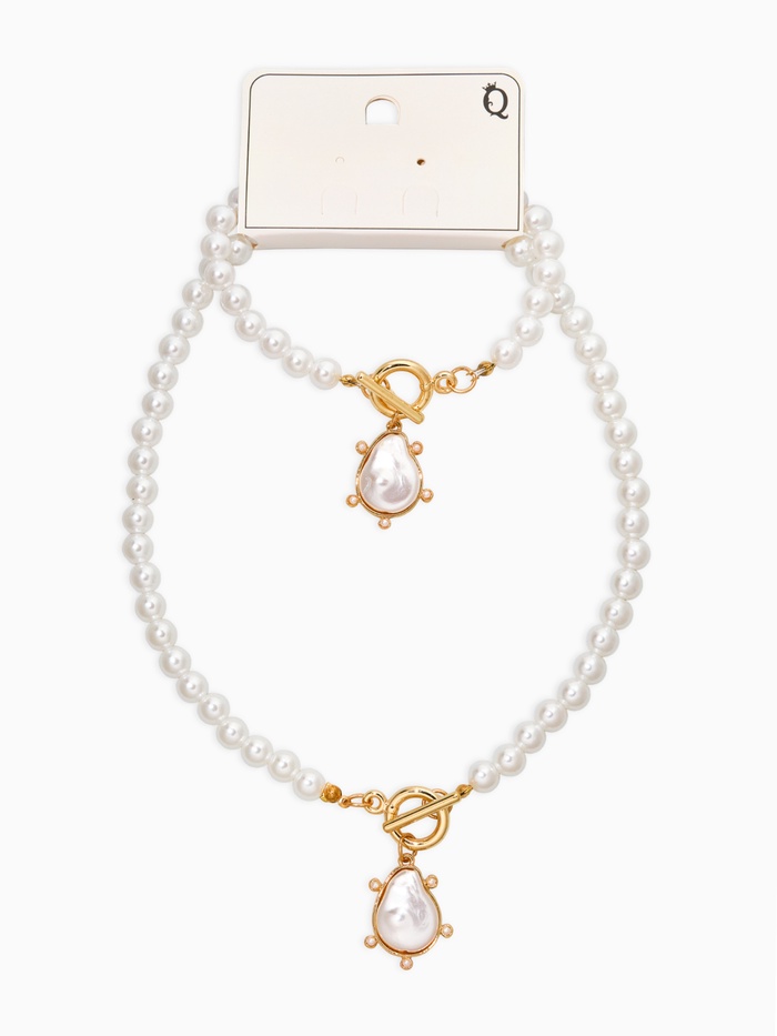 Набор, в который вошли изысканное колье и утончённый браслет, воплощает современное видение классической жемчужной эстетики. Белые бусины и подвеска в гармонии с золотистой фурнитурой создают впечатление лёгкости и изящества, подчеркивая естественную красоту и женственность.