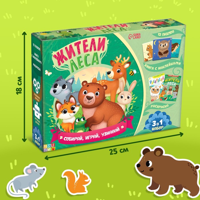 - Внутри коробки вы найдёте 12 пазлов, книжку с наклейками и раскраску про лесных животных.