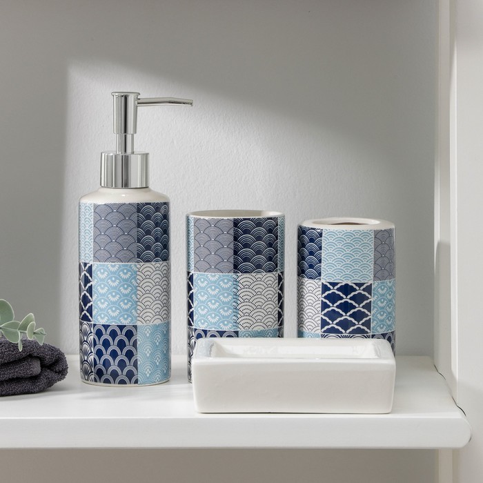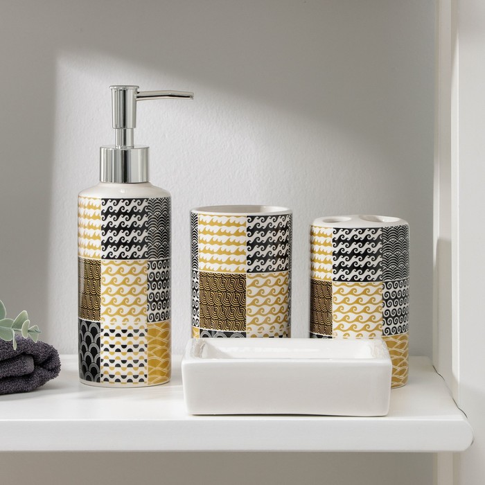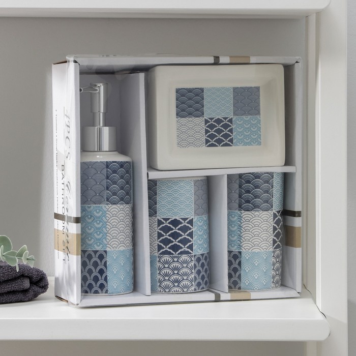 Набор аксессуаров организует пространство и станет стильным украшением Вашей ванной комнаты. За счет сдержанного дизайна данный керамический набор в ванную подойдет к любому дизайну ванной комнаты. Набор состоит из 4 предметов: 2 стакана, мыльница, дозатор.