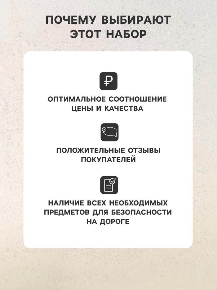 - Соответствие требованиям: набор включает все основные предметы, рекомендованные правилами дорожного движения;