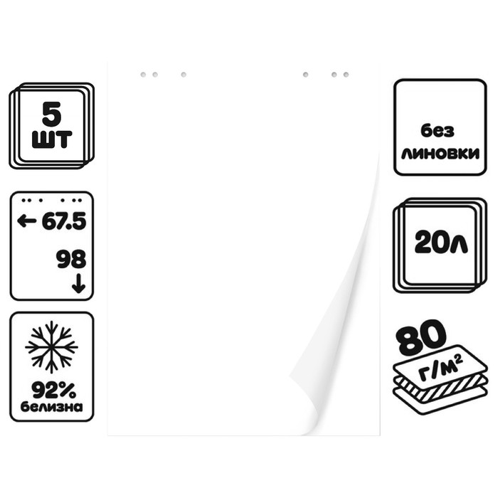 Набор удобных блокнотов 5 штук Calligrata подходит для использования с различными моделями досок-флипчартов. Бумага для флипчартoв со стандартными крепежными отверстиями. Поставляется блоками формата 67,5 х 98 см по 20 листов. Белизна 92%, плотность 80 г/м2.