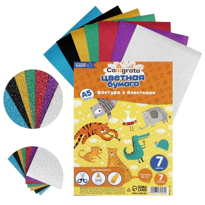 Набор бумаги с блёстками А5, 7 листов, 7 цветов, 80 г/м²