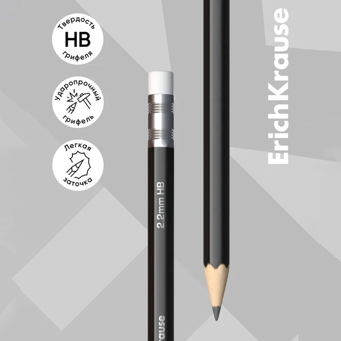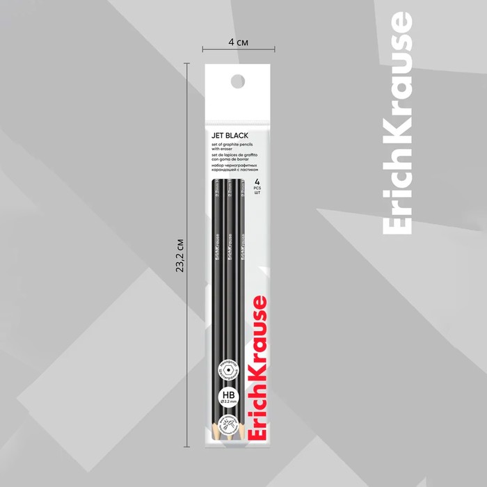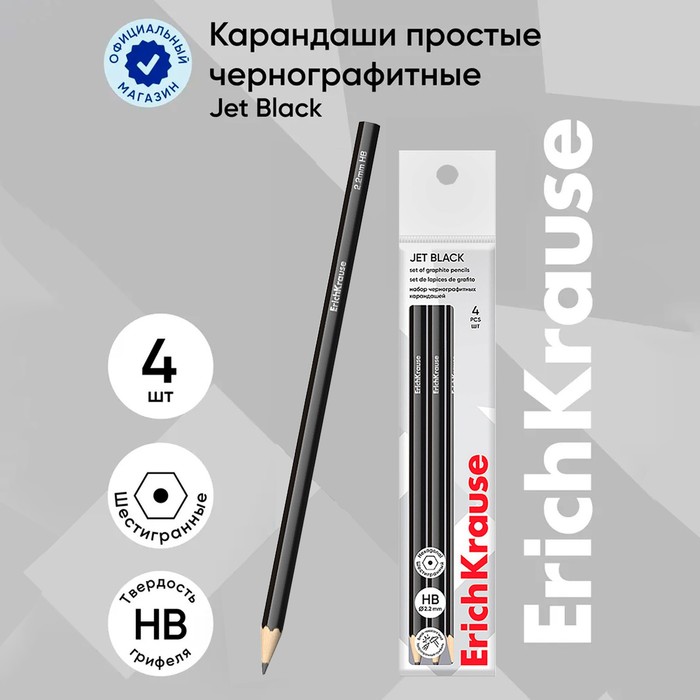 Набор чернографитных карандашей с ластиком 4 штуки ErichKrause «Jet Black», HB, грифель d=2.2 мм, дерево, шестигранных в пакете, чёрный корпус