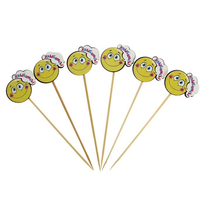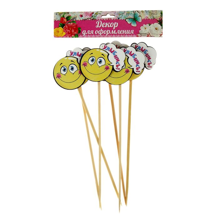 Набор декора на палочке "Улыбнись" (6 шт.), 6 х6см добавит оригинальный акцент цветочному горшку, букету или набору кондитерских изделий. Деревянные элементы с авторскими рисунками подчеркнут ваш хороший вкус и станут ярким украшением.