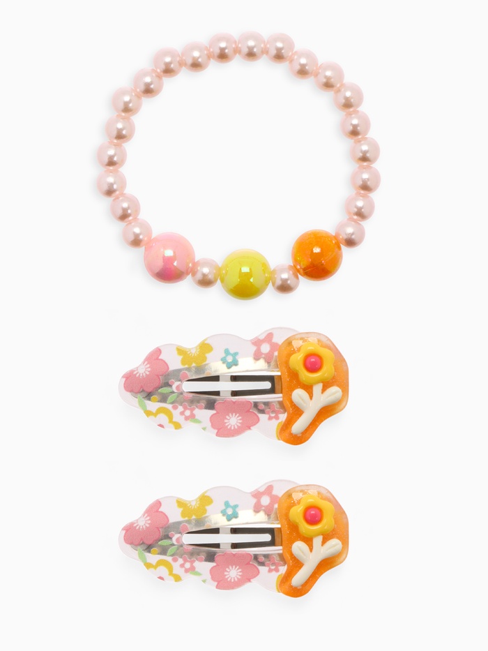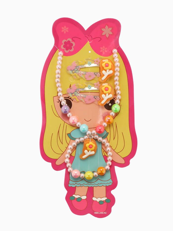 Набор детских украшений в бежевых тонах включает браслет, кулон и две заколки, создавая гармоничный и универсальный образ для девочки. Комплект сочетает пластик и металл, обеспечивая лёгкость и прочность изделий.