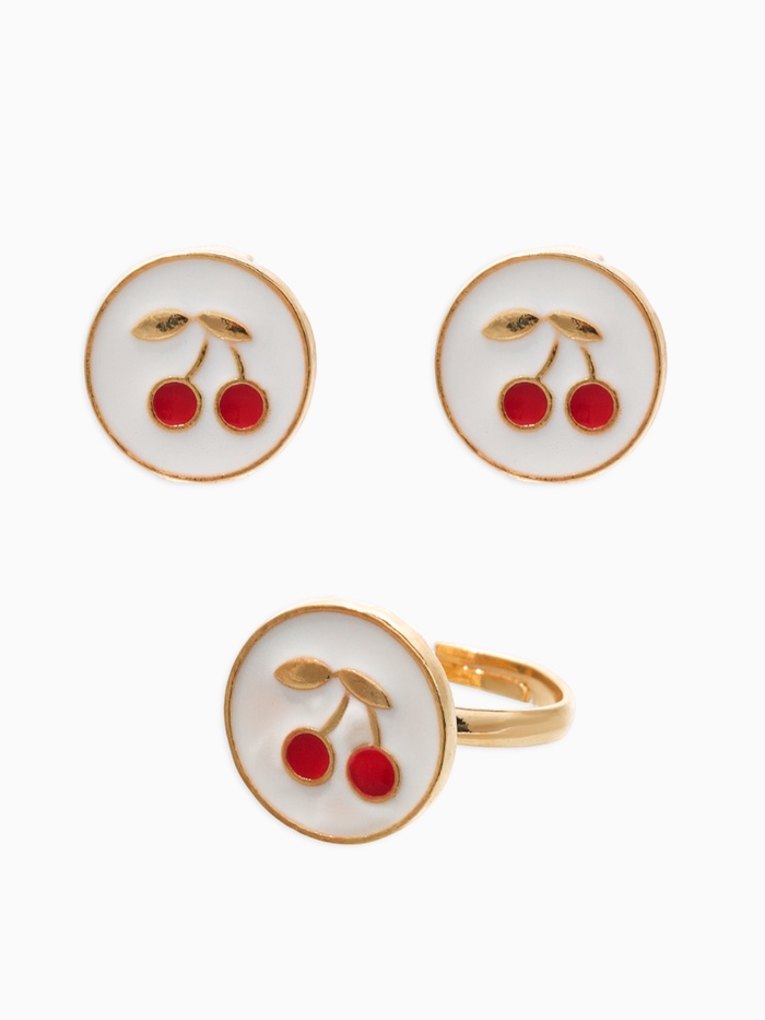 Набор детский "Выбражулька" 3 пред-а: кулон, кольцо, серьги, вишня, бело-красный в золоте