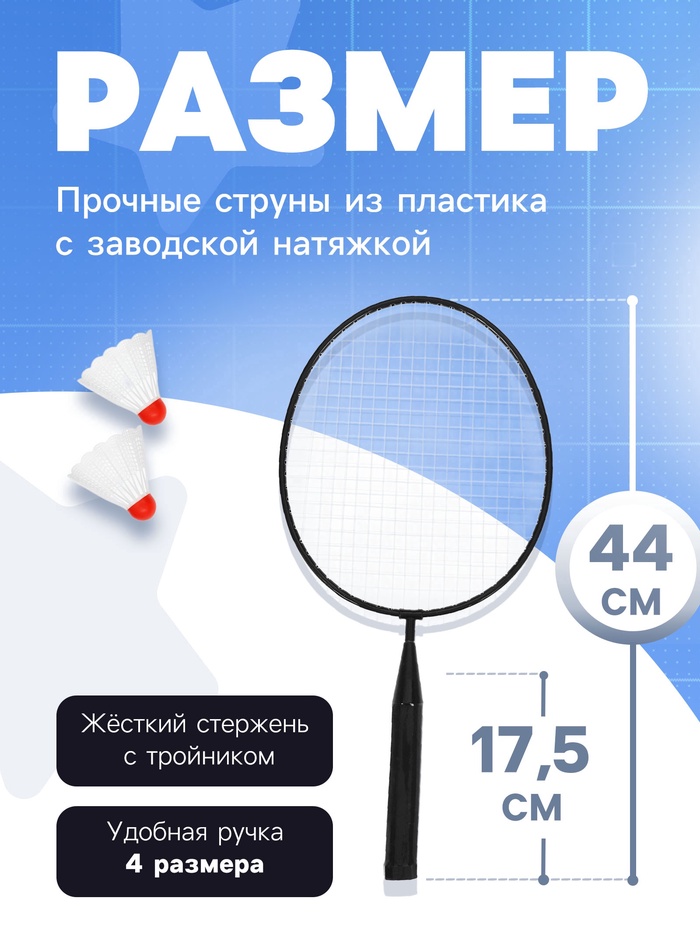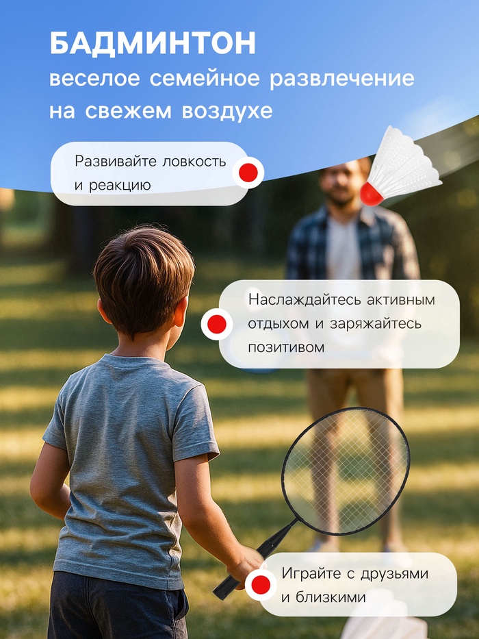 Бадминтон — весёлое летнее развлечение. Возьмите на прогулку полный комплект для увлекательного и активного досуга на свежем воздухе. Детские ракетки подойдут для юных спортсменов, ими также можно играть в теннис.