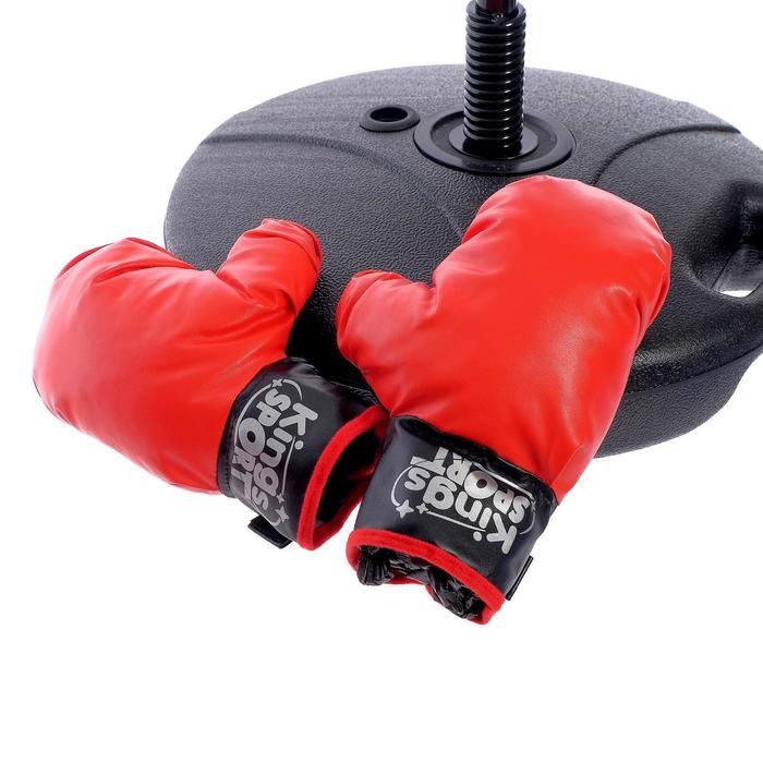 - В комплект входят боксерские перчатки, надежно фиксирующиеся на руках, и насос для подкачки груши.